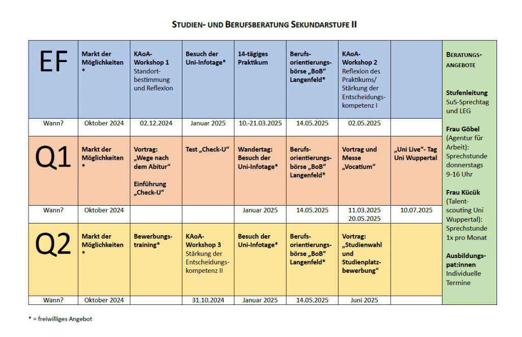 Alle Schülerinnen und Schüler der Oberstufe können in Absprache mit ihrer Stufenleitung Veranstaltungen der „Wochen der Studienorientierung“, die jedes Jahr an verschiedenen Universitäten im Januar und Februar stattfinden, besuchen. Dort haben die Lernenden unter anderem die Möglichkeit, sich intensiv über verschiedene Studiengänge, Studienabschlüsse und Einschreibvoraussetzungen zu informieren.