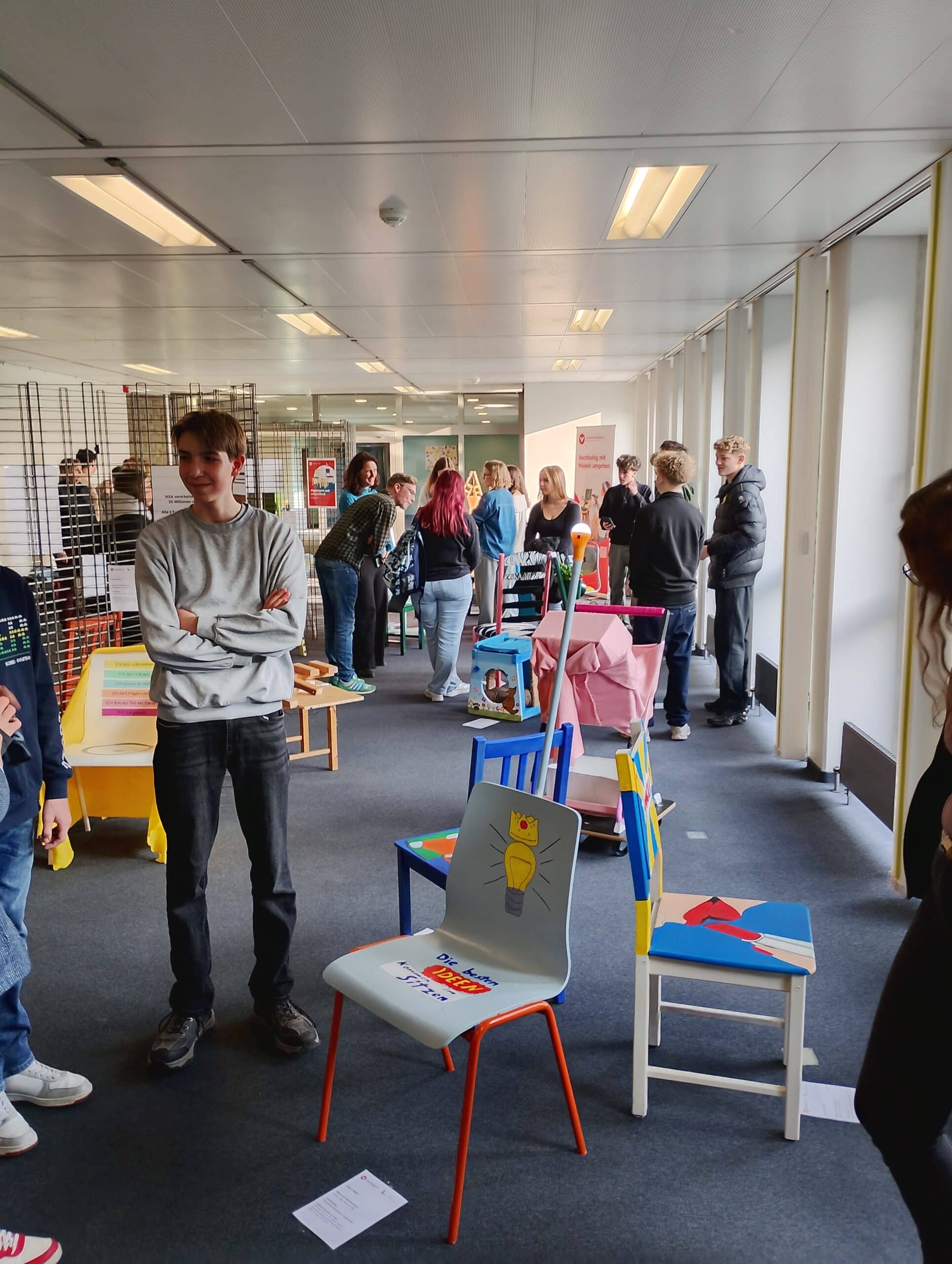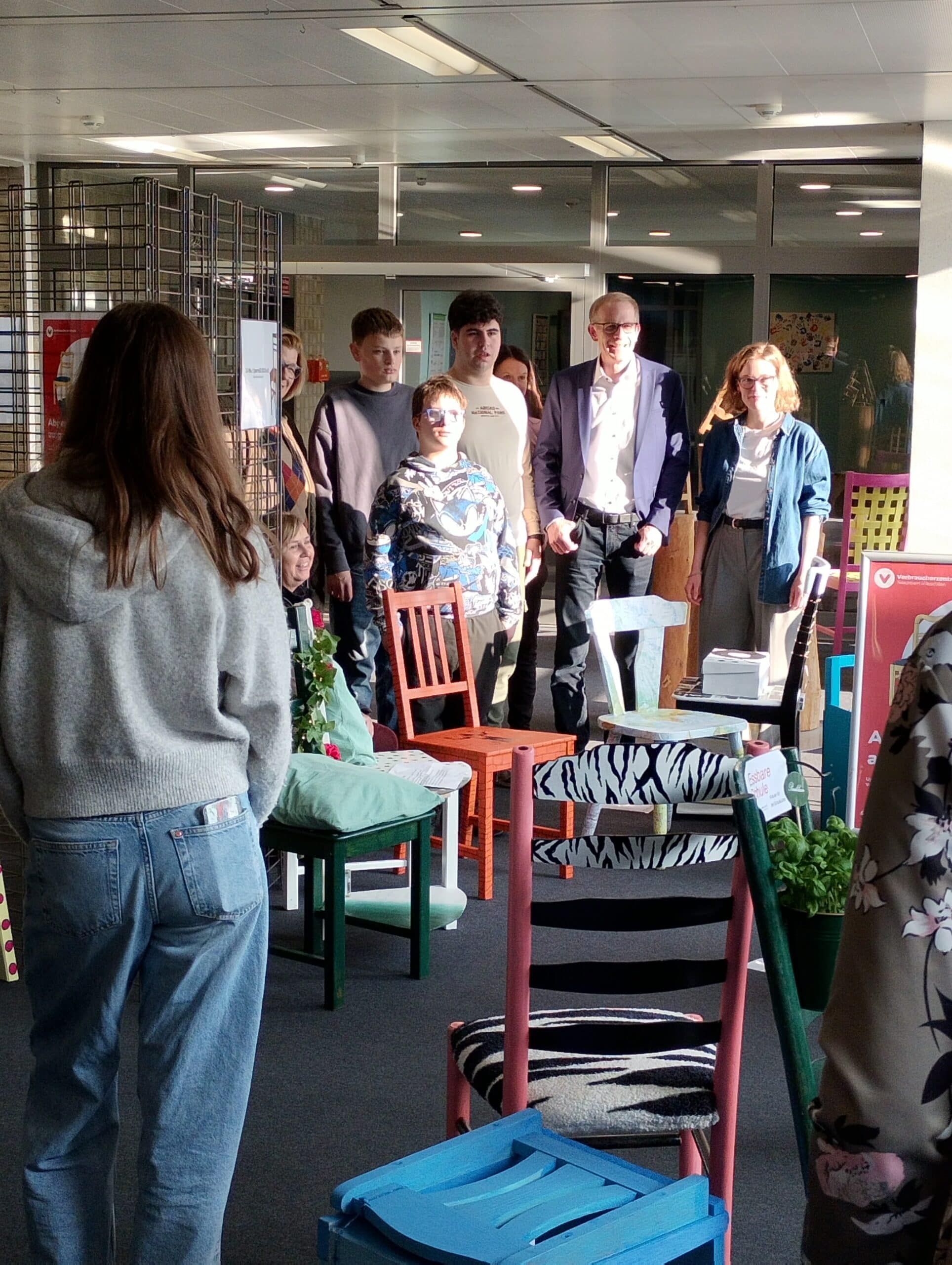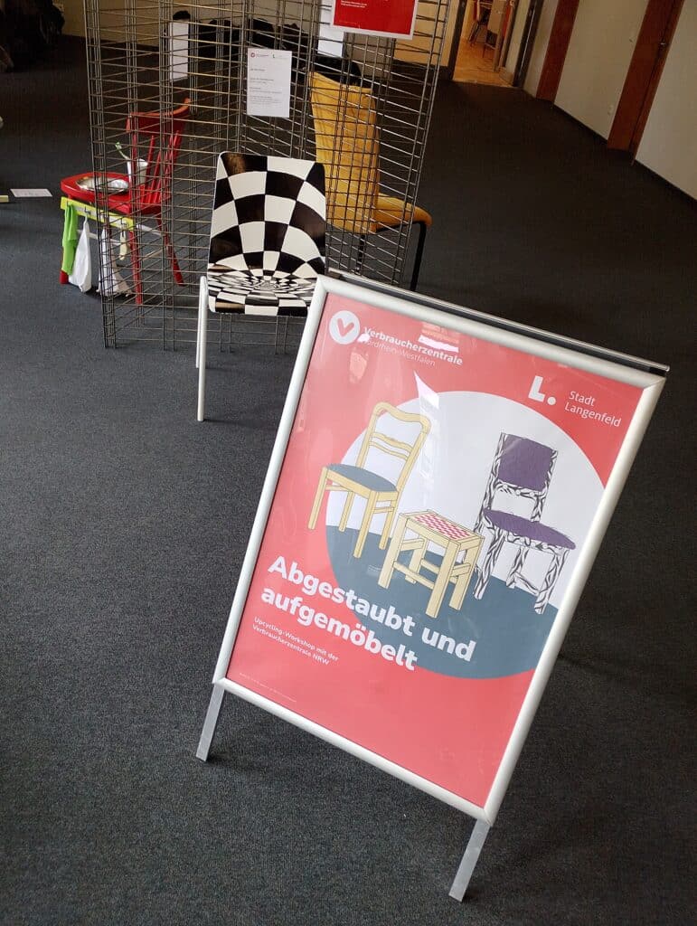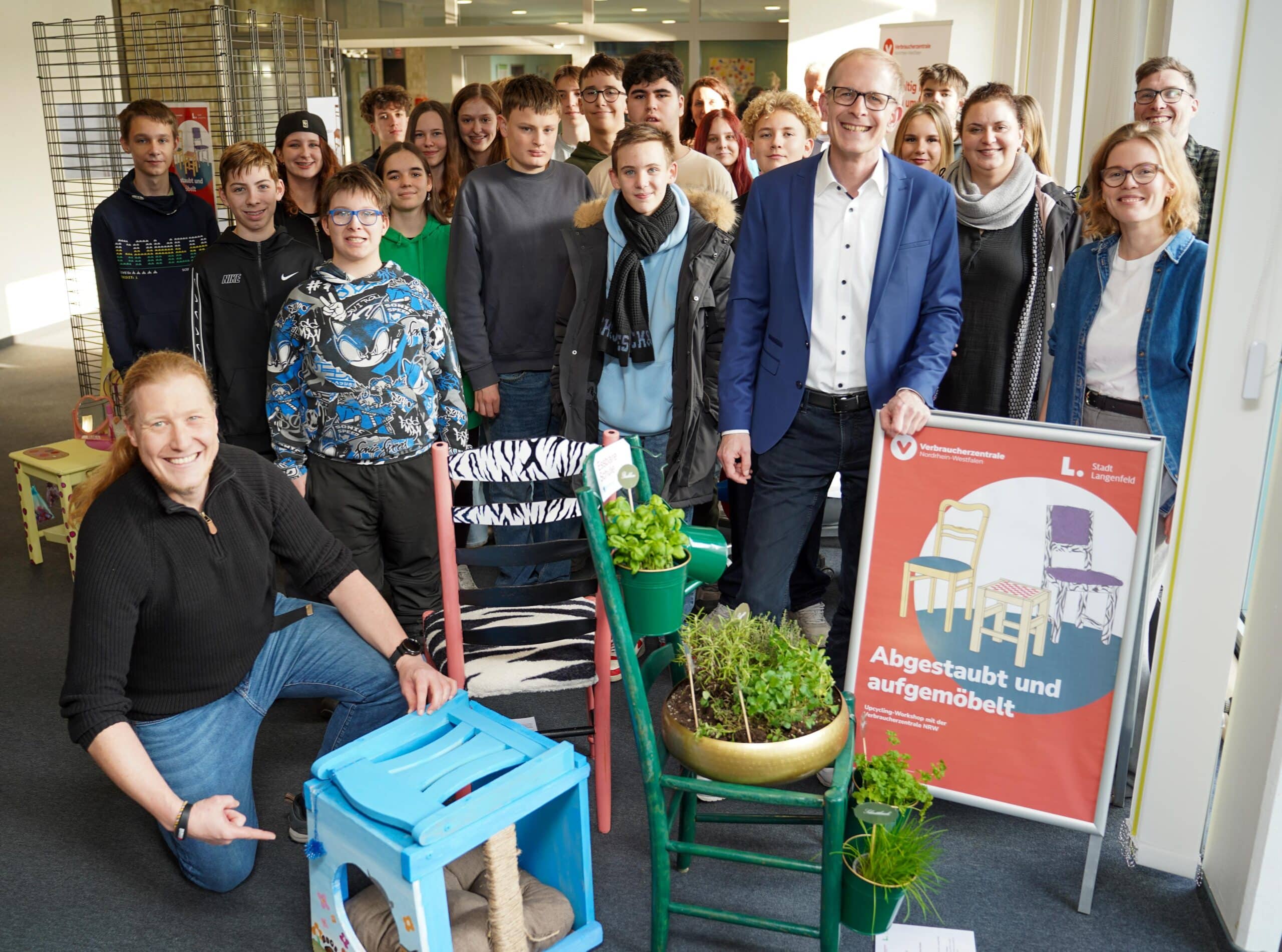In einem Wettbewerb der Umweltberatung der Verbraucherzentrale in Langenfeld gemeinsam mit der Stadt Langenfeld haben Schülerinnen und Schüler dreier Schulen gebrauchte Stühle repariert und verschönert.