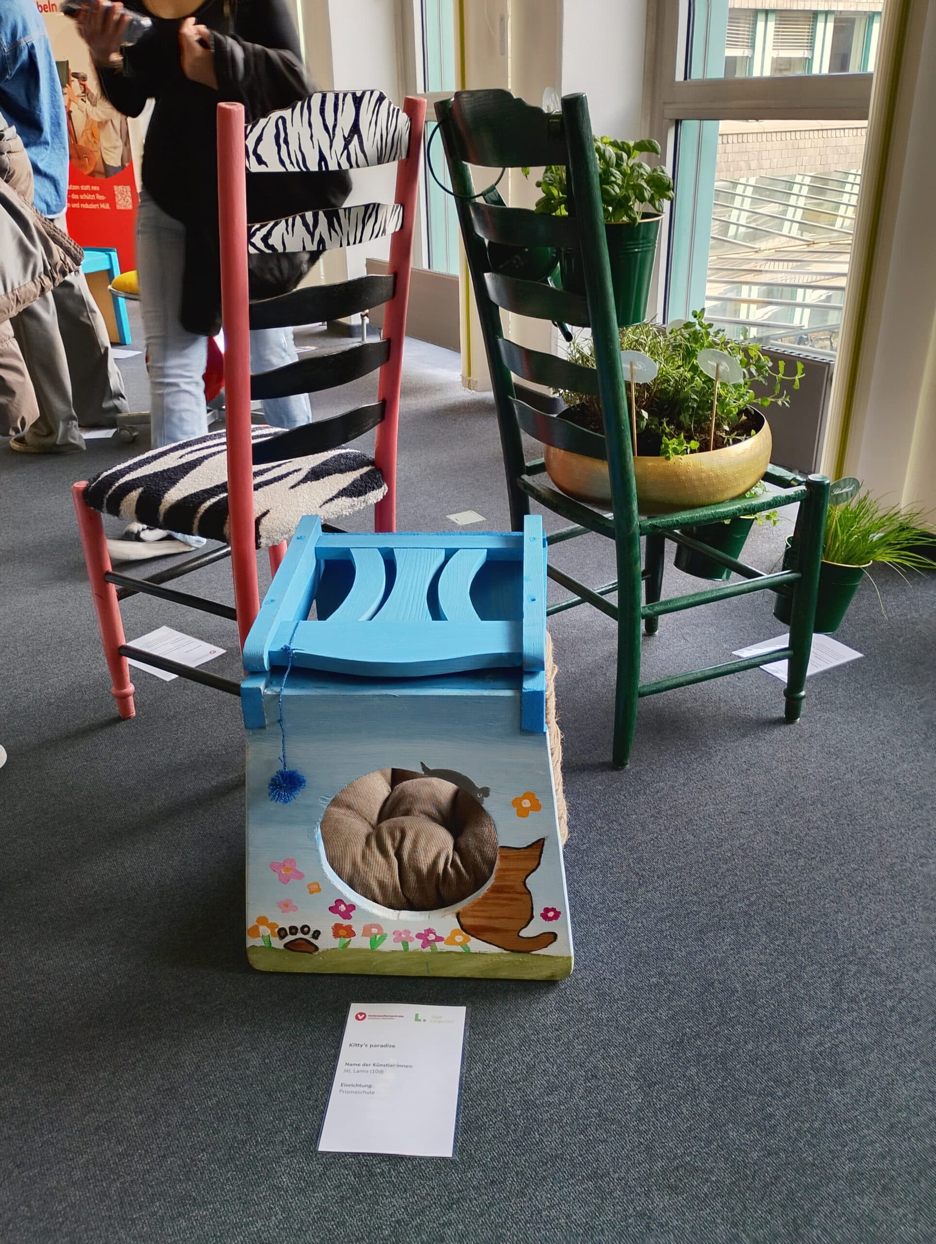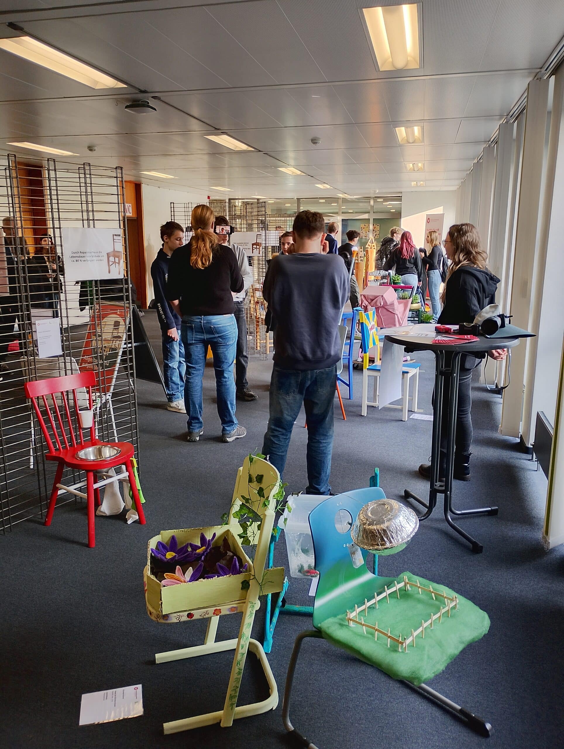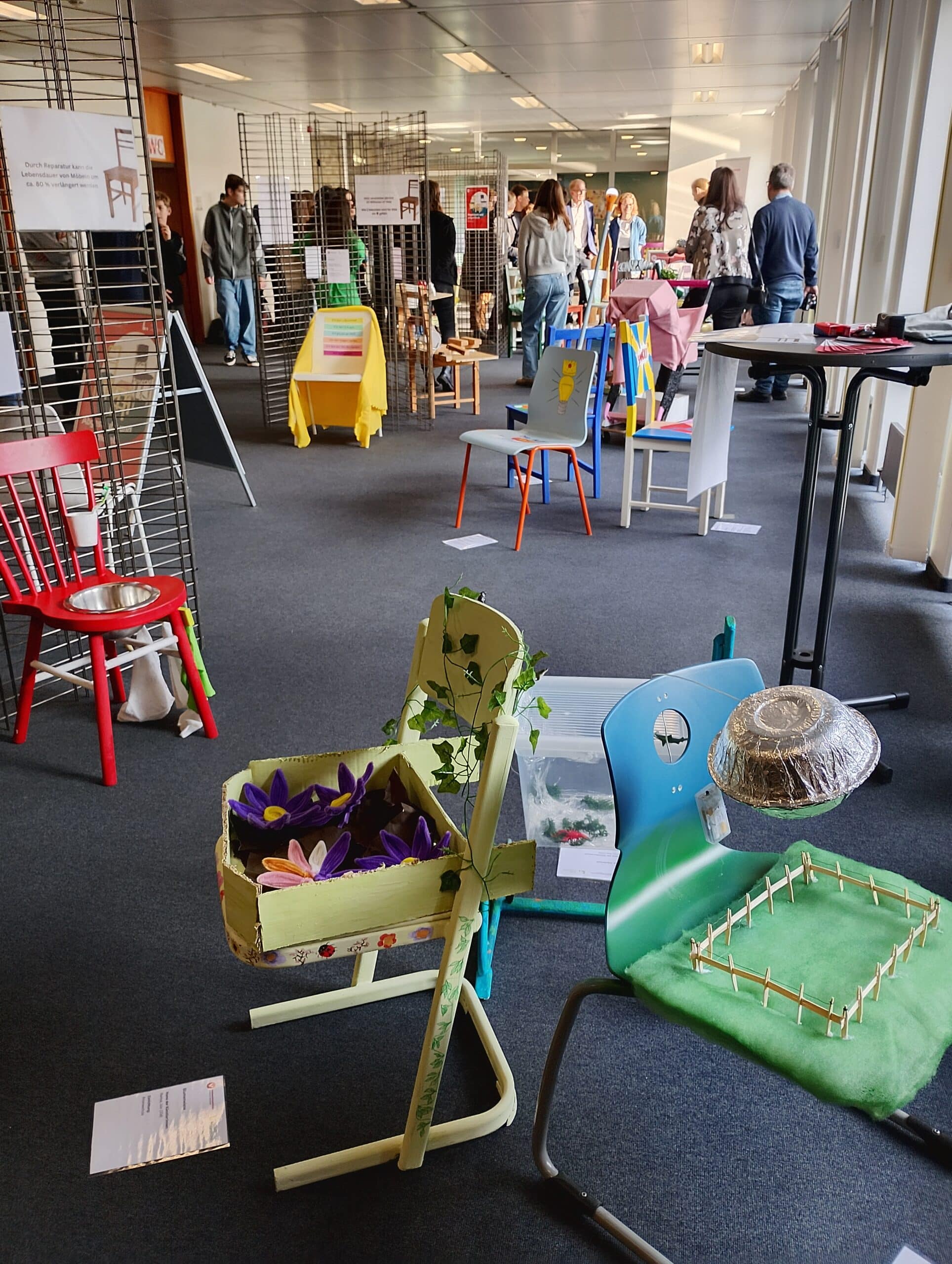 Ausstellung zum Upcycling-Wettbewerb zeigt alte Stühle in neuem Glanz.